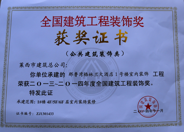 12月11日至12日,中國(guó)建筑裝飾三十年紀(jì)念大會(huì)在北京國(guó)家會(huì)議中心隆重召開。住建部副部長(zhǎng)王寧、中國(guó)建筑裝飾協(xié)會(huì)會(huì)長(zhǎng)李秉仁、秘書長(zhǎng)劉曉一等領(lǐng)導(dǎo)到會(huì)。大會(huì)對(duì)2013—2014年全國(guó)裝飾獎(jiǎng)獲獎(jiǎng)單位進(jìn)行了表彰。我公司施工的那魯灣格蘭大酒店1#樓室內(nèi)裝飾工程獲獎(jiǎng)。