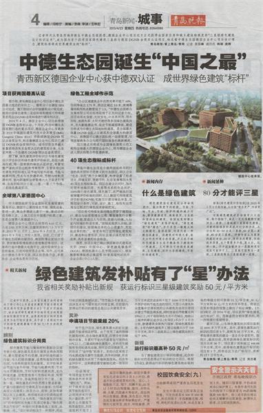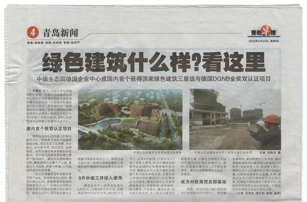 2015年4月23日出版的《青島早報(bào)》《青島晚報(bào)》高度評(píng)價(jià)了我公司施工的中德生態(tài)園德國(guó)企業(yè)中心項(xiàng)目。