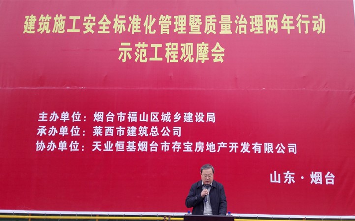 12月1日,煙臺市福山區(qū)城鄉(xiāng)建設(shè)局主辦的煙臺市“建筑施工標(biāo)準化管理暨建筑工程質(zhì)量治理兩年行動”示范工程觀摩會在七公司仲濤項目部施工的天業(yè)盛世景苑召開。煙臺市質(zhì)檢站站長劉輝生、福山區(qū)城鄉(xiāng)建設(shè)局局長周道隆、分管副局長宋夕純、福山區(qū)建管處主任蔣建、副主任牛成斌、天業(yè)恒基煙臺存寶房地產(chǎn)有限公司總經(jīng)理肖劍、七公司總經(jīng)理吳克祥出席了觀摩會。煙臺市安全、質(zhì)量機構(gòu)負責(zé)人以及建設(shè)、監(jiān)理、施工總承包共計143家單位、項目負責(zé)人參加了本次觀摩會,觀摩人員達300余人。