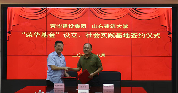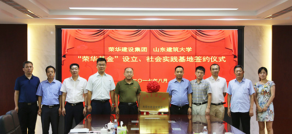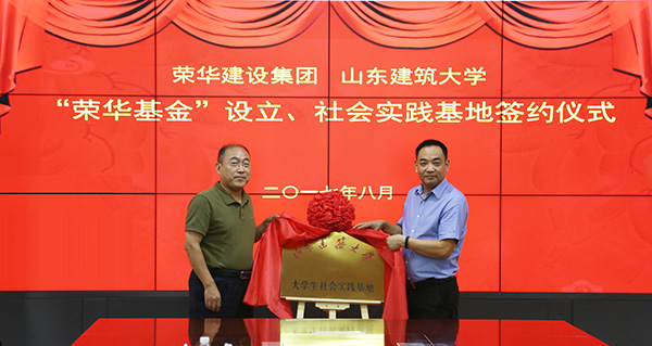 山東建筑大學(xué)土木學(xué)院黨委書記李建軍與我集團公司副總裁馬桂學(xué)簽署“榮華基金”設(shè)立協(xié)議書和大學(xué)生社會實踐基地協(xié)議書;山東建筑大學(xué)土木學(xué)院黨委書記李建軍與我集團公司總裁趙成福為大學(xué)生社會實踐基地揭牌。