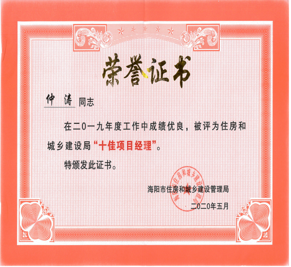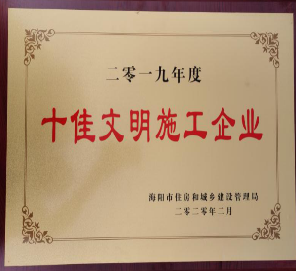 近日,集團(tuán)公司被海陽市住房和規(guī)劃建設(shè)管理局評為“二零一九年度十佳文明施工企業(yè)”榮譽(yù)稱號,項(xiàng)目經(jīng)理仲濤被評為住房和城鄉(xiāng)建設(shè)局“十佳項(xiàng)目經(jīng)理”榮譽(yù)稱號。