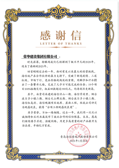 近日,集團(tuán)公司收到青島海信房地產(chǎn)股份有限公司發(fā)來(lái)的感謝信,對(duì)過去一年與集團(tuán)公司的通力合作表示衷心的感謝。