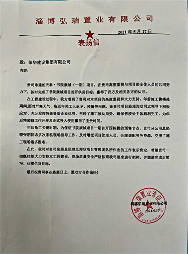 濟南公司鄭欣項目部受到淄博弘瑞置業(yè)有限公司表揚