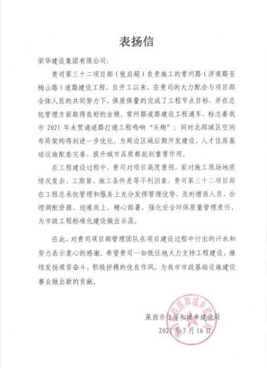 近期,集團總部收到萊西市住房和城鄉(xiāng)建設(shè)局發(fā)來的表揚信,對張啟超項目部負責施工的常州路(濟南路至梅山路)道路建設(shè)工程提出表揚。