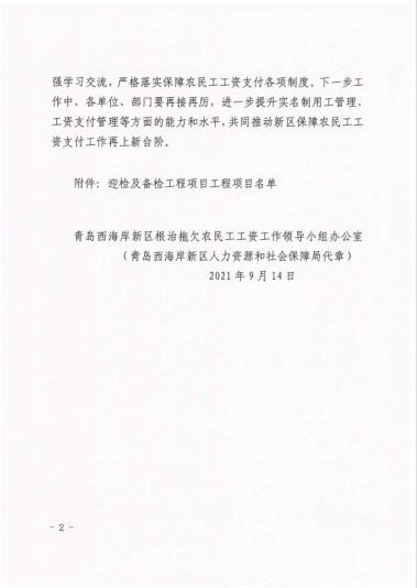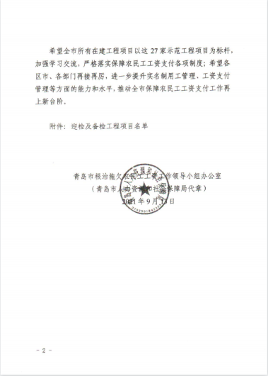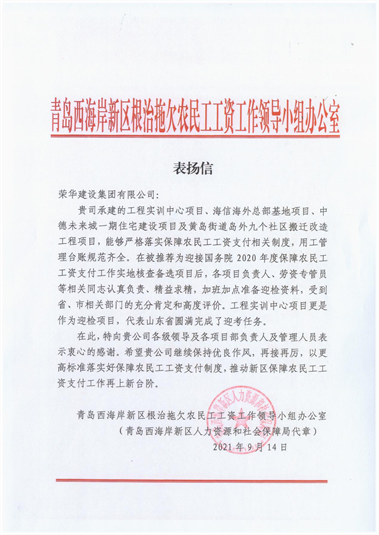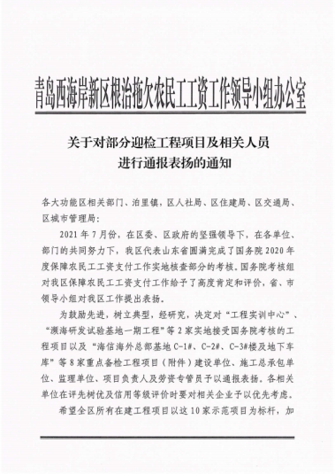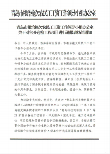 近期,集團(tuán)公司總部收到來自青島市、西海岸新區(qū)兩級根治拖欠農(nóng)民工工資工作領(lǐng)導(dǎo)小組辦公室發(fā)來的通報(bào)表揚(yáng)。對集團(tuán)公司承建的山東科技大學(xué)工程實(shí)訓(xùn)中心項(xiàng)目、海信海外總部基地項(xiàng)目、中德未來城一期住宅建設(shè)項(xiàng)目、黃島街道島外九個(gè)社區(qū)搬遷改造工程、平度市新舊動能轉(zhuǎn)換產(chǎn)業(yè)園建設(shè)項(xiàng)目(一期)中小企業(yè)產(chǎn)業(yè)園1.1-1.3期項(xiàng)目、海信.鳳臺世家、青島萊西市人才公寓建設(shè)項(xiàng)目、東城時(shí)代項(xiàng)目等8個(gè)工程提出表揚(yáng)。