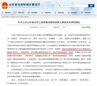 近日,山東省住房和城鄉(xiāng)建設廳公示了山東省住宅工程質量創(chuàng)意短視頻大賽獲獎名單,確定241項作品獲獎,其中三公司王淳項目部《被動式超低能耗住宅工程常見問題預防和控制》榮獲一等獎第一名,六公司劉輝項目部《精裝修交付滲漏開裂防控》獲得二等獎,榮華(青島)建設科技有限公司《裝配式混凝土建筑質量控制要點》獲得三等獎。