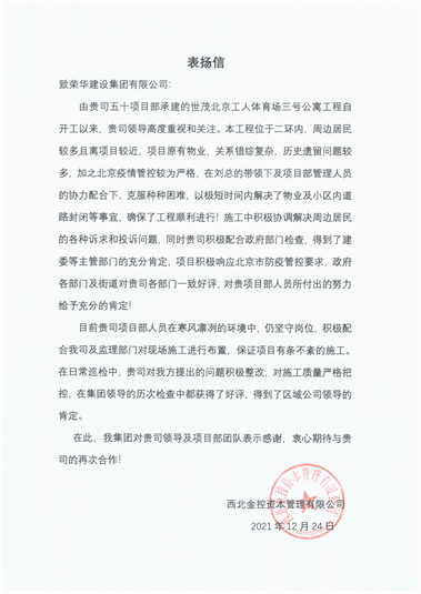近日,集團(tuán)公司收到西北金控資本管理有限公司發(fā)來(lái)的表?yè)P(yáng)信,對(duì)八公司史寶座項(xiàng)目部施工的世貿(mào)北京工人體育場(chǎng)三號(hào)公寓工程提出表?yè)P(yáng)。