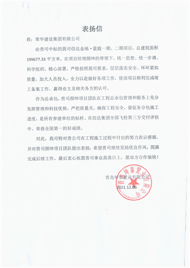 近日,集團公司收到青島坤泰置業(yè)有限公司發(fā)來的表揚信,對開發(fā)區(qū)公司顏坤項目部施工的信達金地·藍庭一期、二期項目提出表揚。