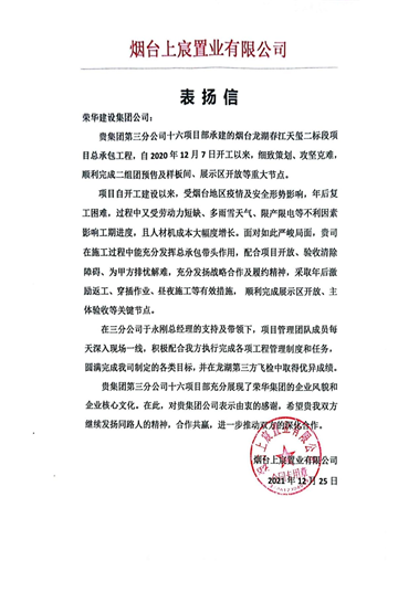 近日,集團公司收到煙臺上宸置業(yè)有限公司發(fā)來的表揚信,對三公司第十六(王慎平)項目部施工的龍湖春江天璽小區(qū)二標(biāo)段項目提出表揚。